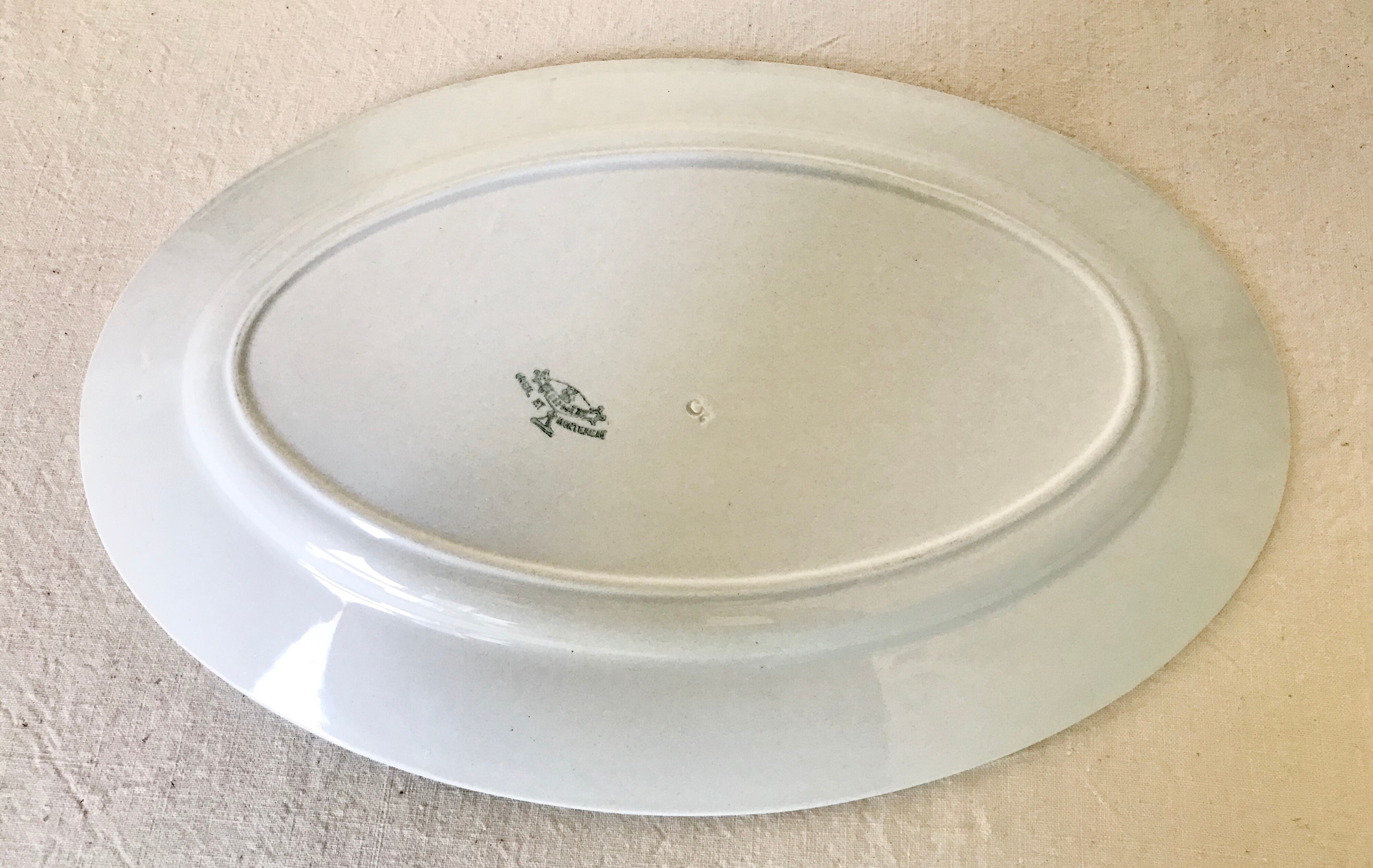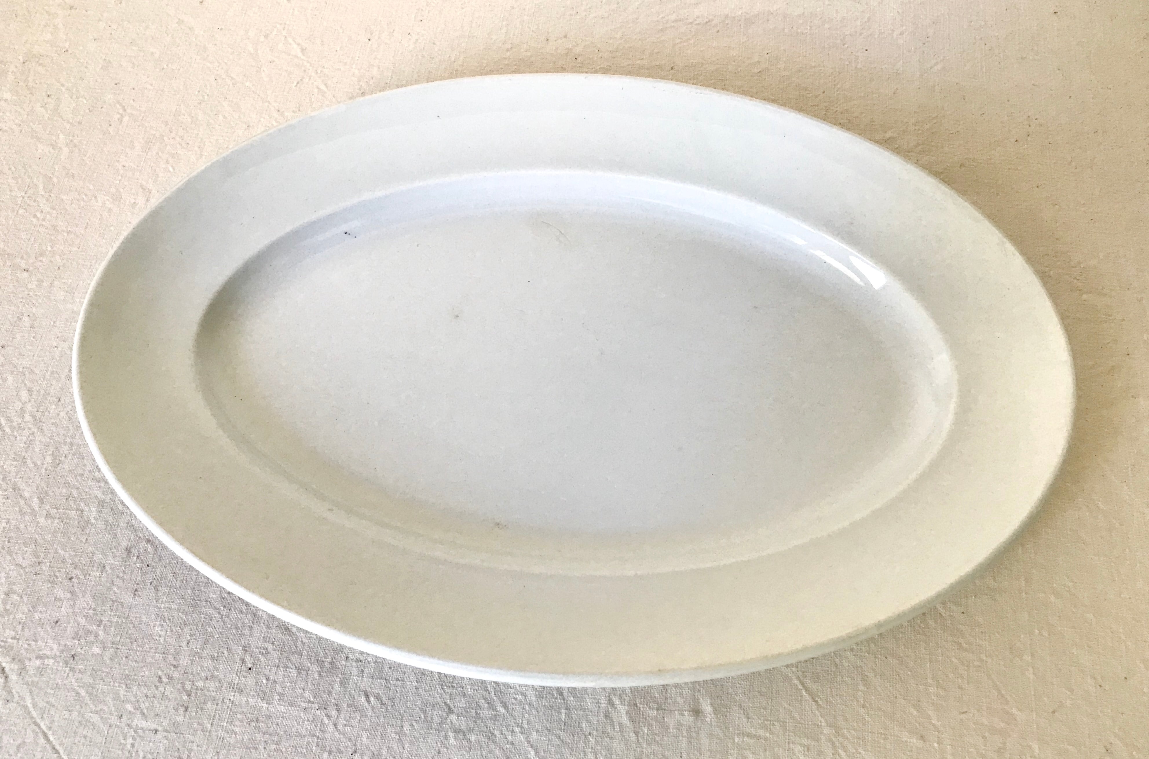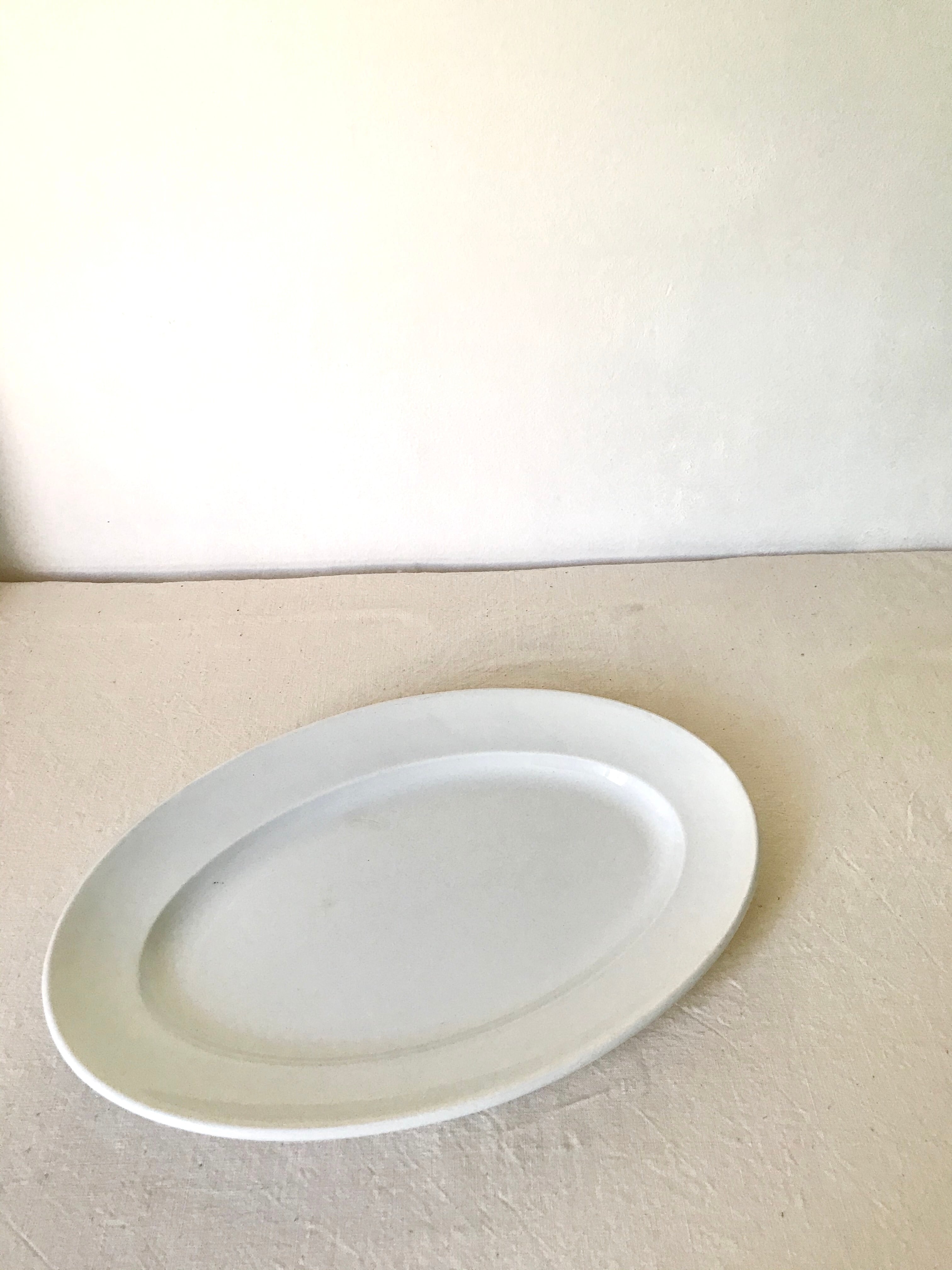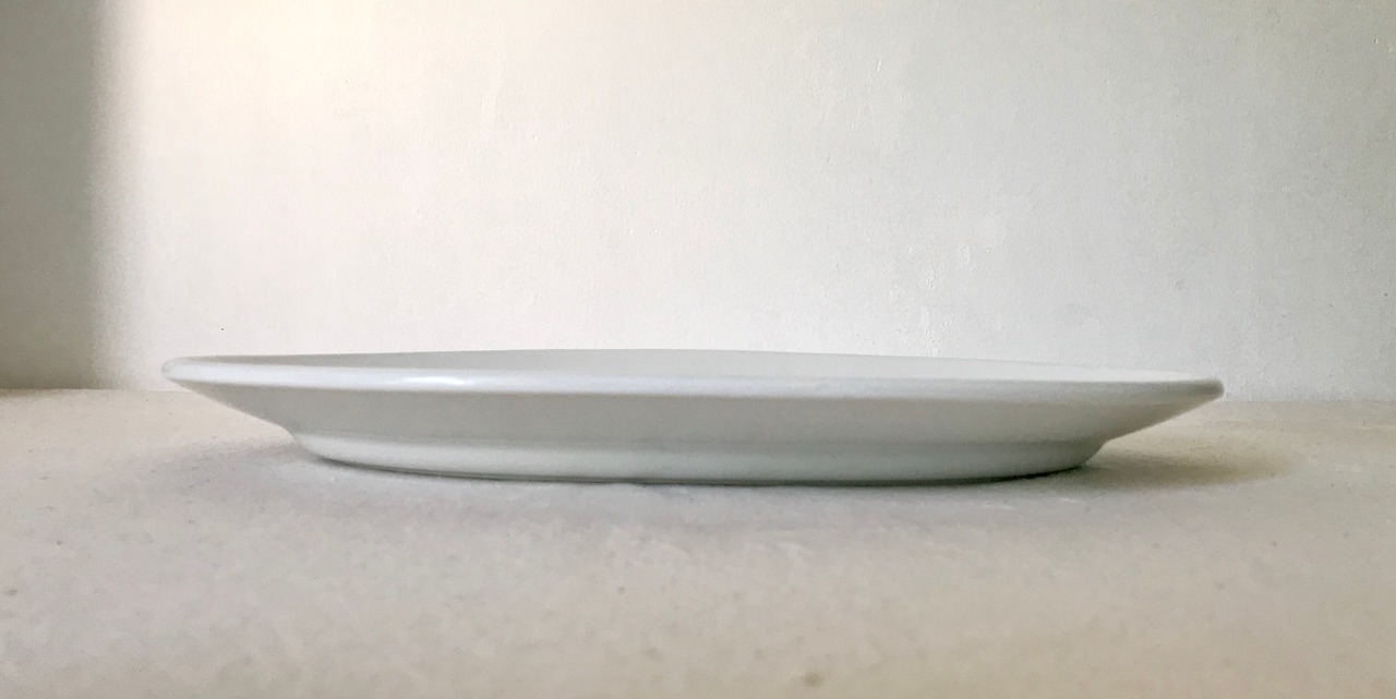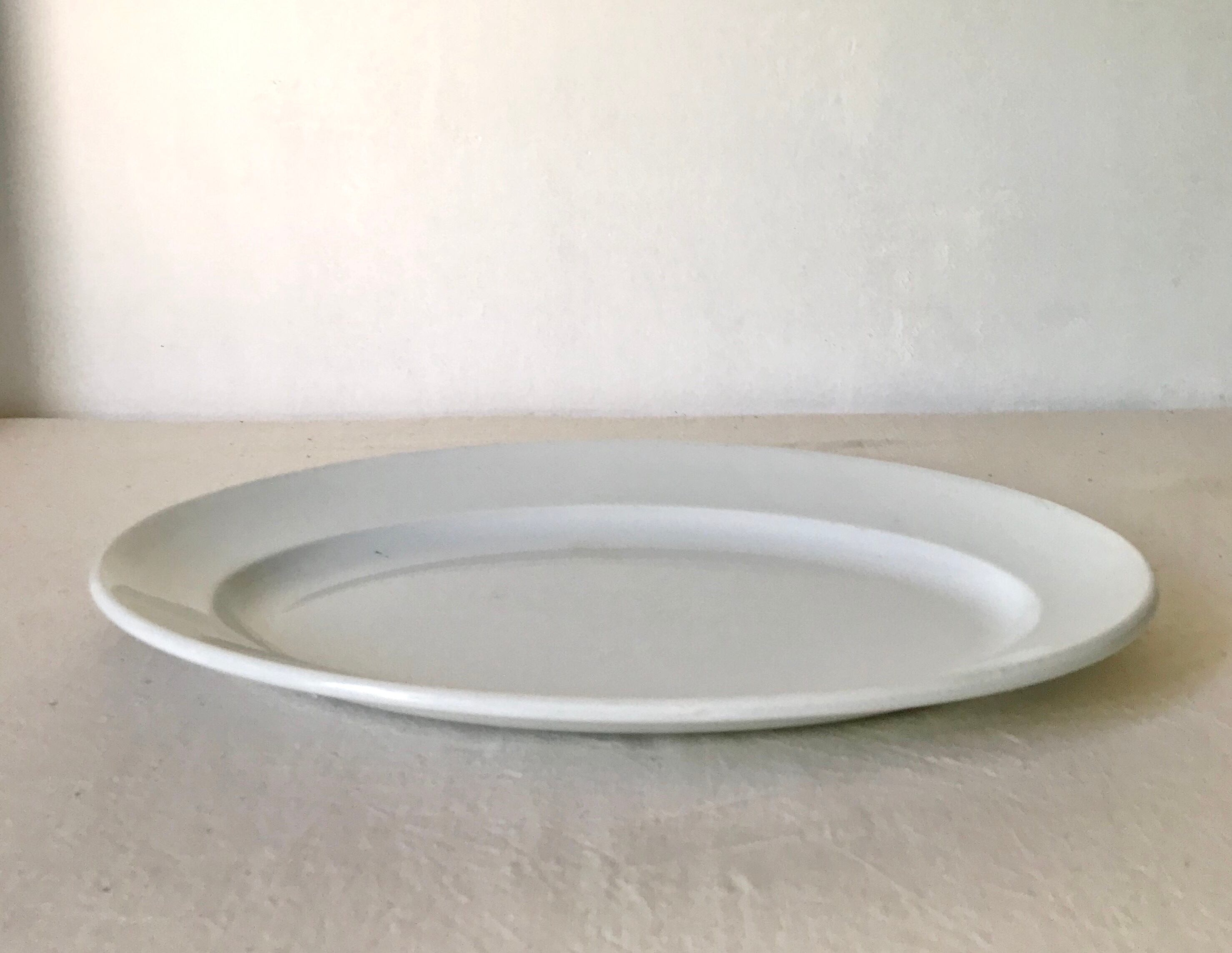 うっすらと青みがかった白釉のシンプルなオーバルプレートは大きめなサイズで存在感があります。
