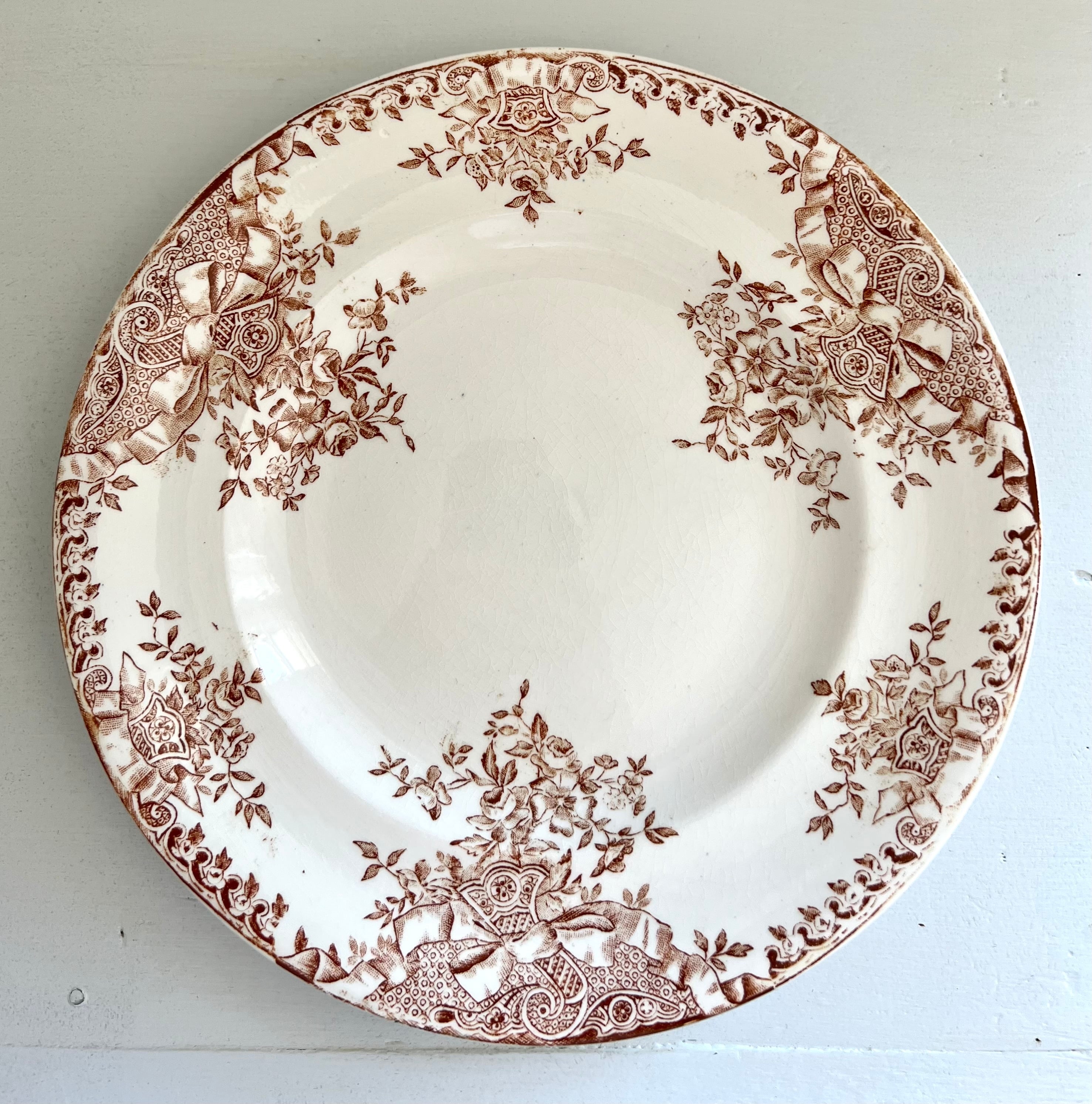 可愛らしいリボンのモチーフと見込みまで描かれた可憐なお花のブーケが素敵なオレンジブラウンのプレートです。