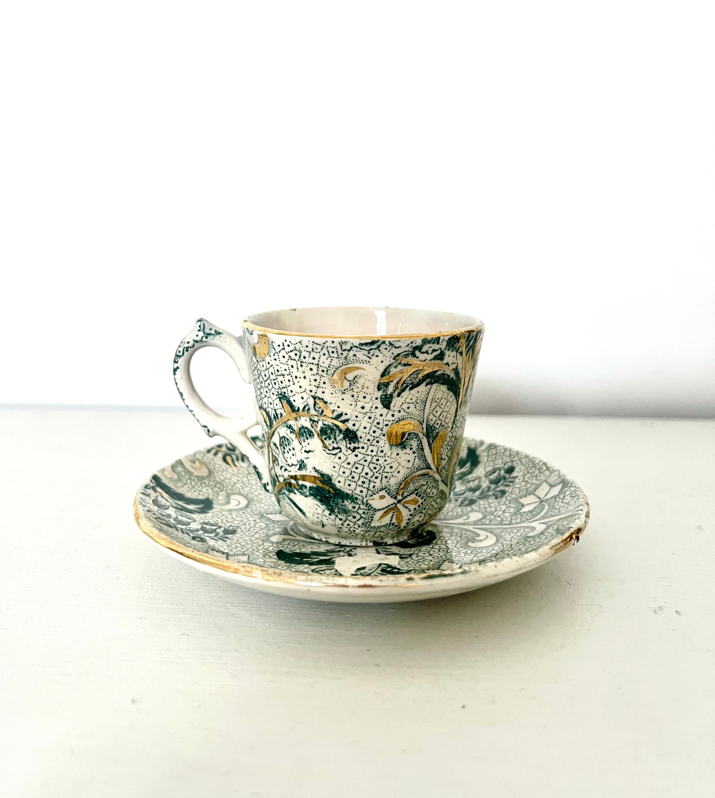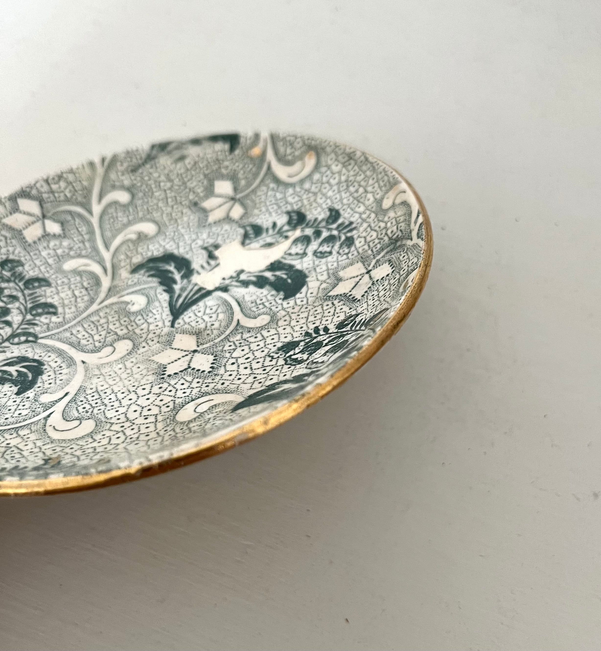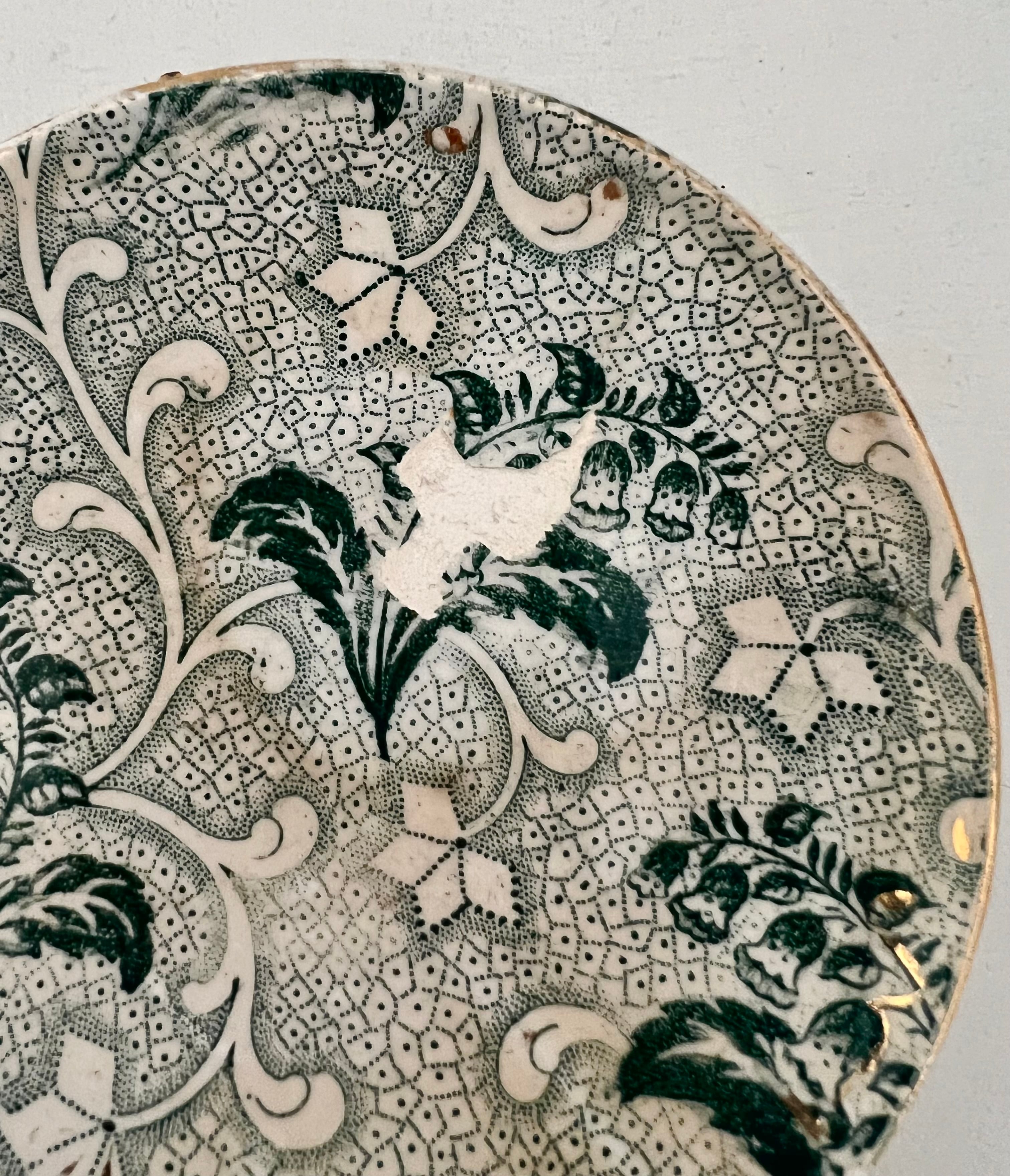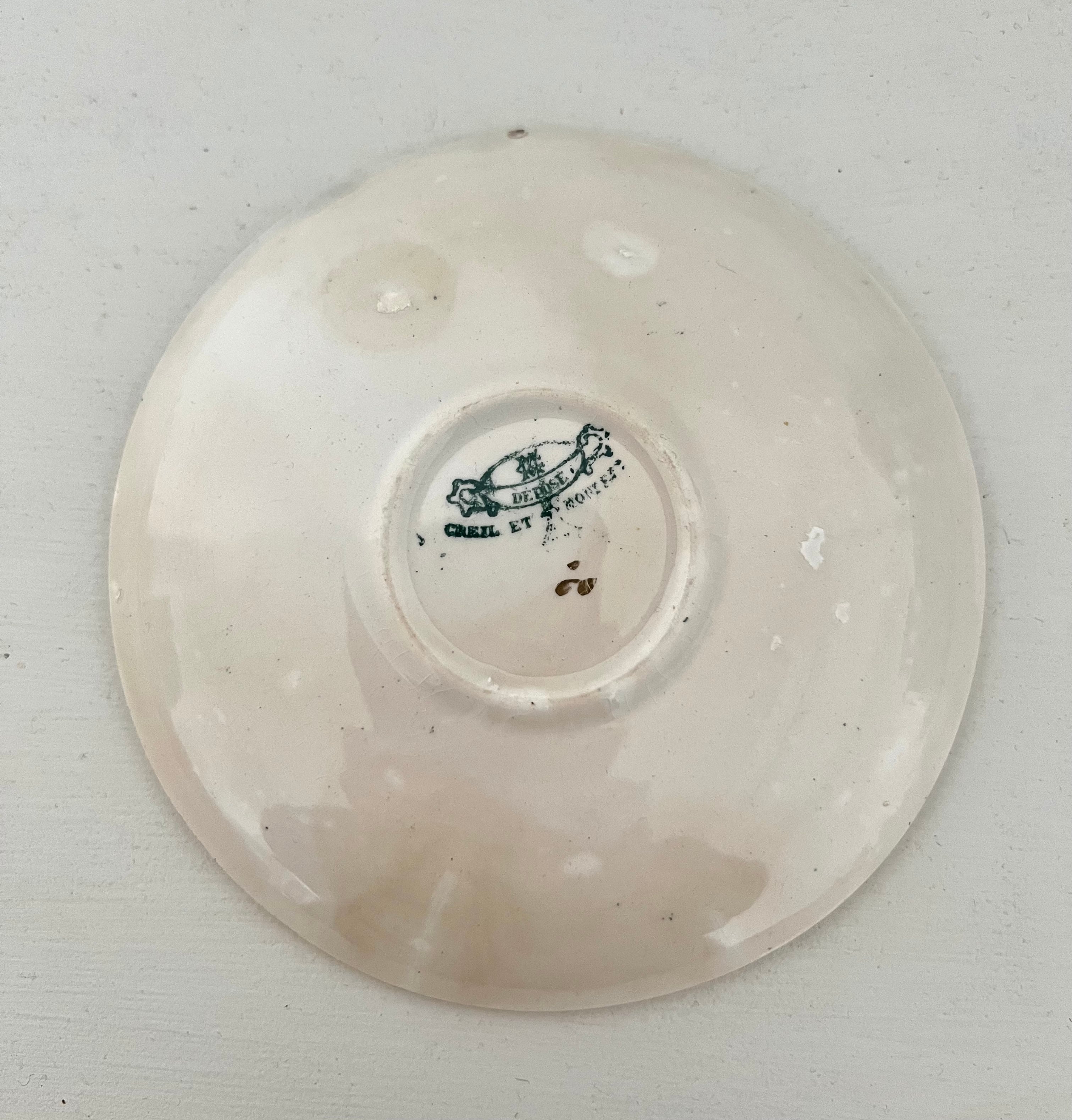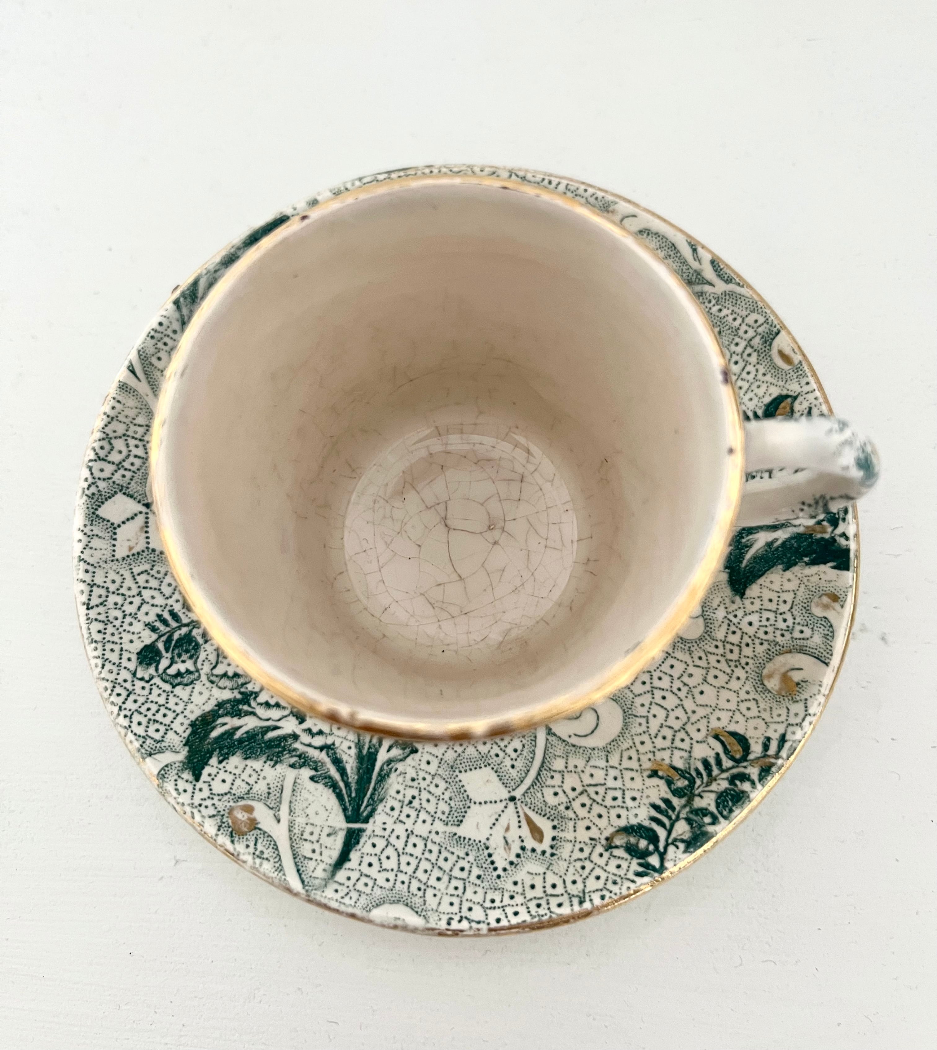 絵柄部分が剥がれている部分に隣接している釉薬が一部脆くなってしまっているので、ソーサーを洗う時などご注意ください。